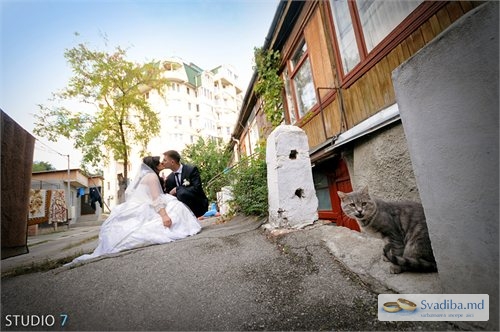 поцелуй жених прогулка свадьба невеста молодожены двор кошка