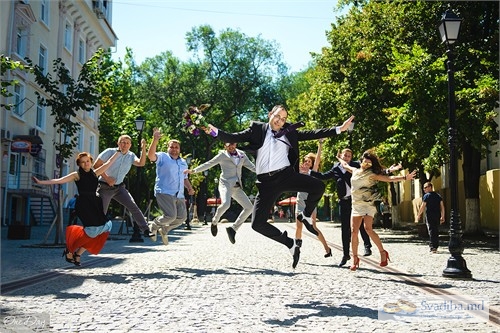 молодожены прогулка невеста гости жених прыжок